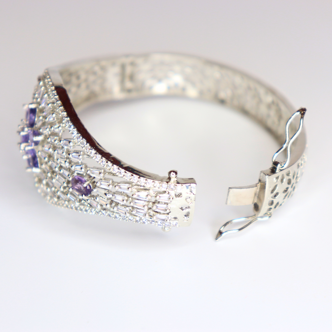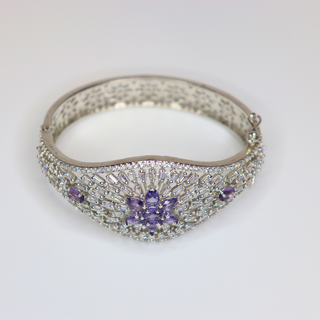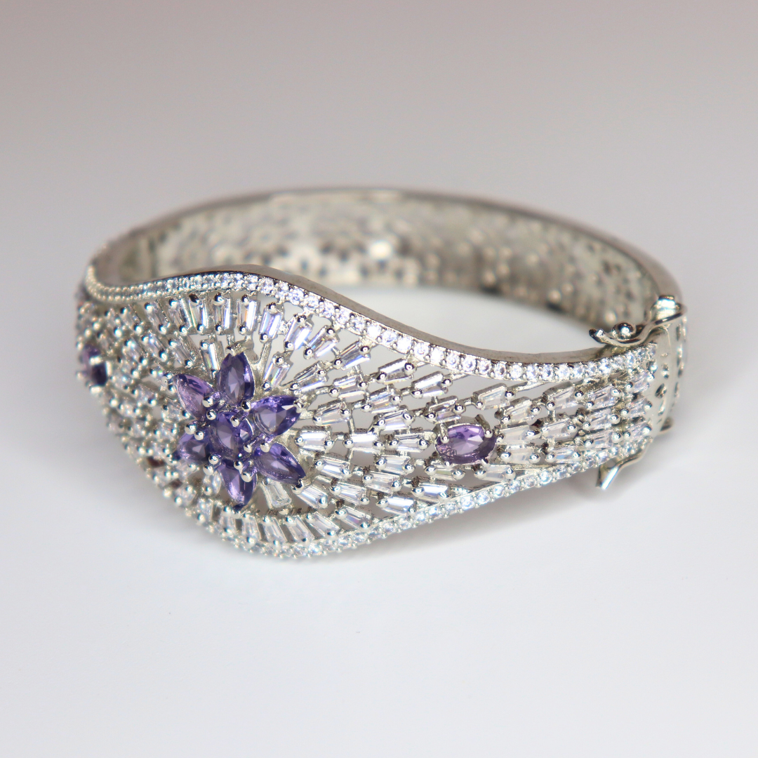 Add a royal touch to your look with this Silver Plated Purple Stone Floral Bangle Bracelet. Featuring a stunning floral centerpiece adorned with purple stones and surrounded by intricate detailing, this bracelet blends grace with sophistication. Perfect for weddings, festive celebrations, parties, and special occasions, it enhances both ethnic and western outfits. A timeless gifting option for women who love luxury-style jewelry.