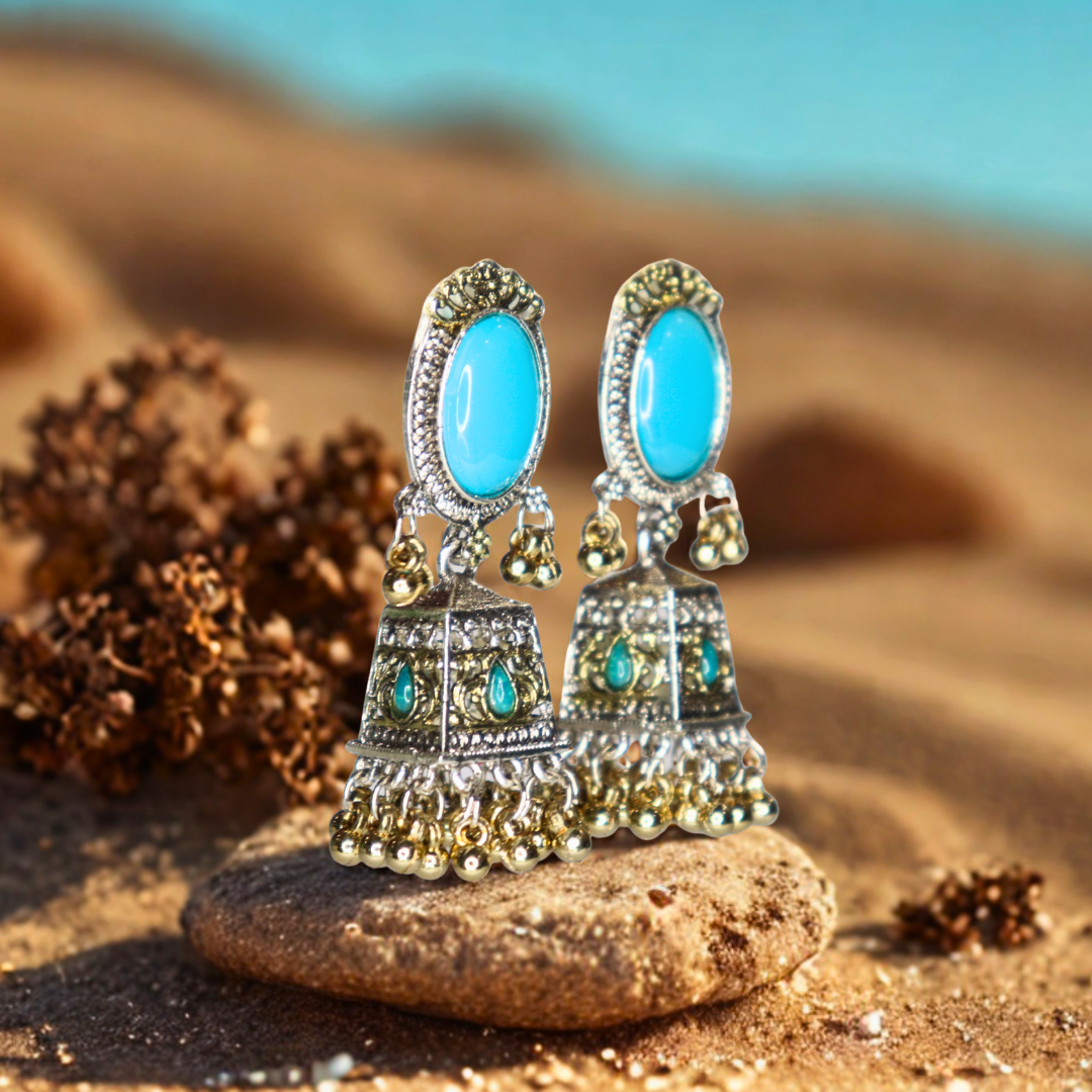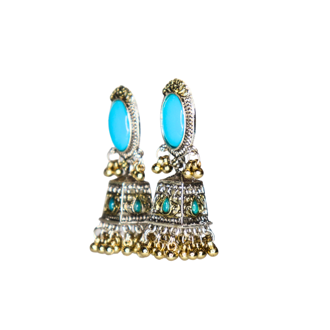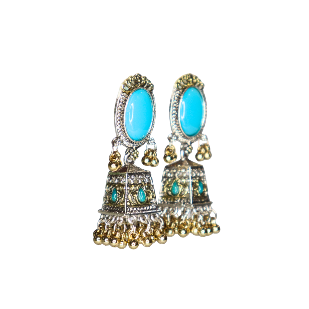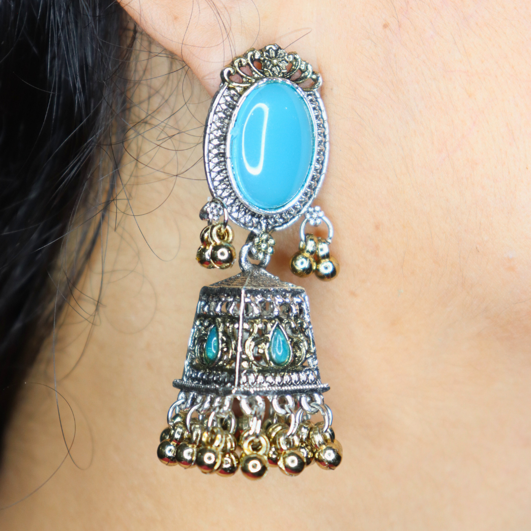 Aquamarine Blue Reflective Glass Stone Oxidized Jhumka