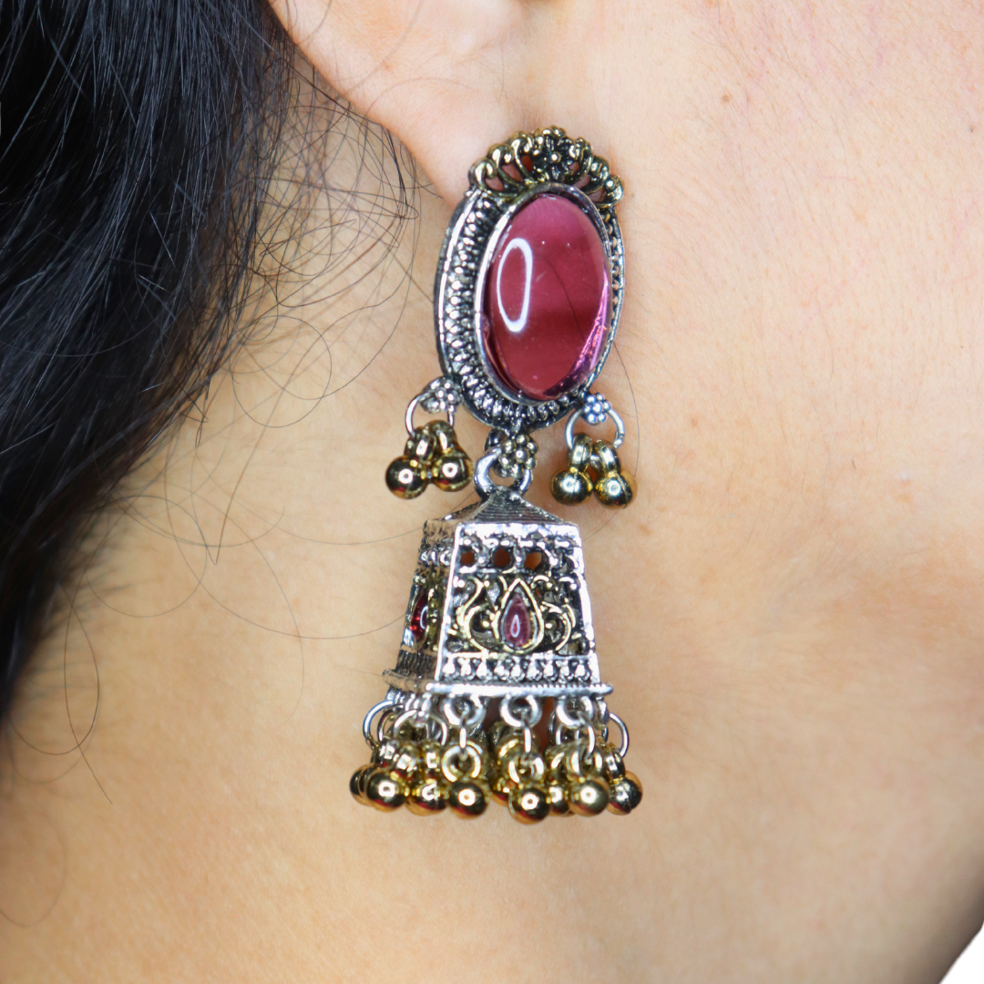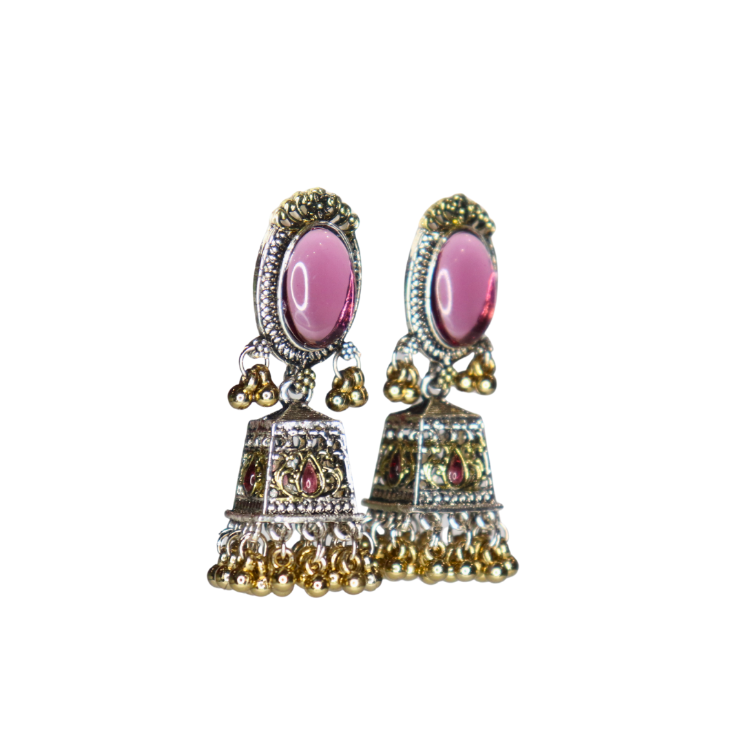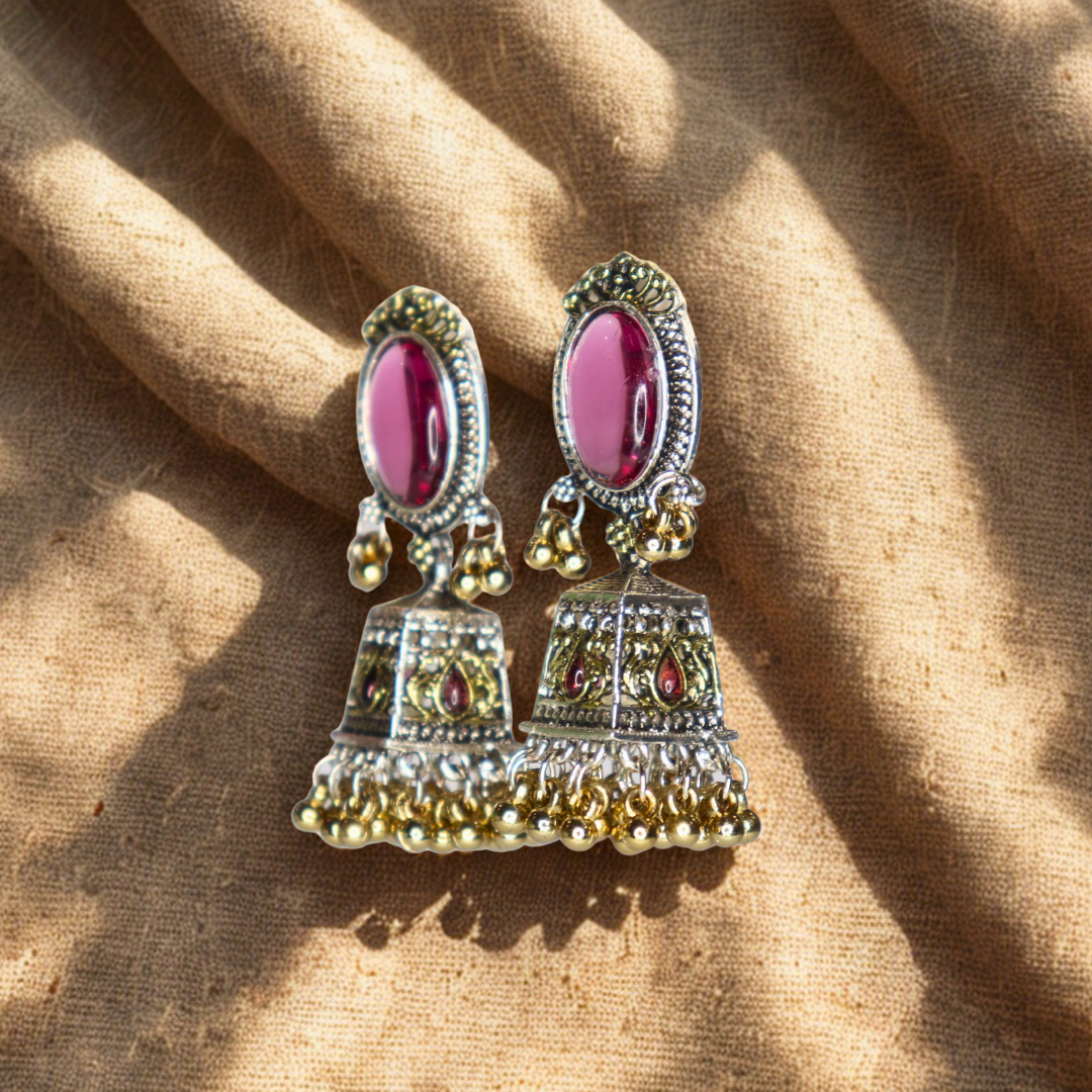 Beautiful Pink Reflective Glass Stone Oxidized Jhumka