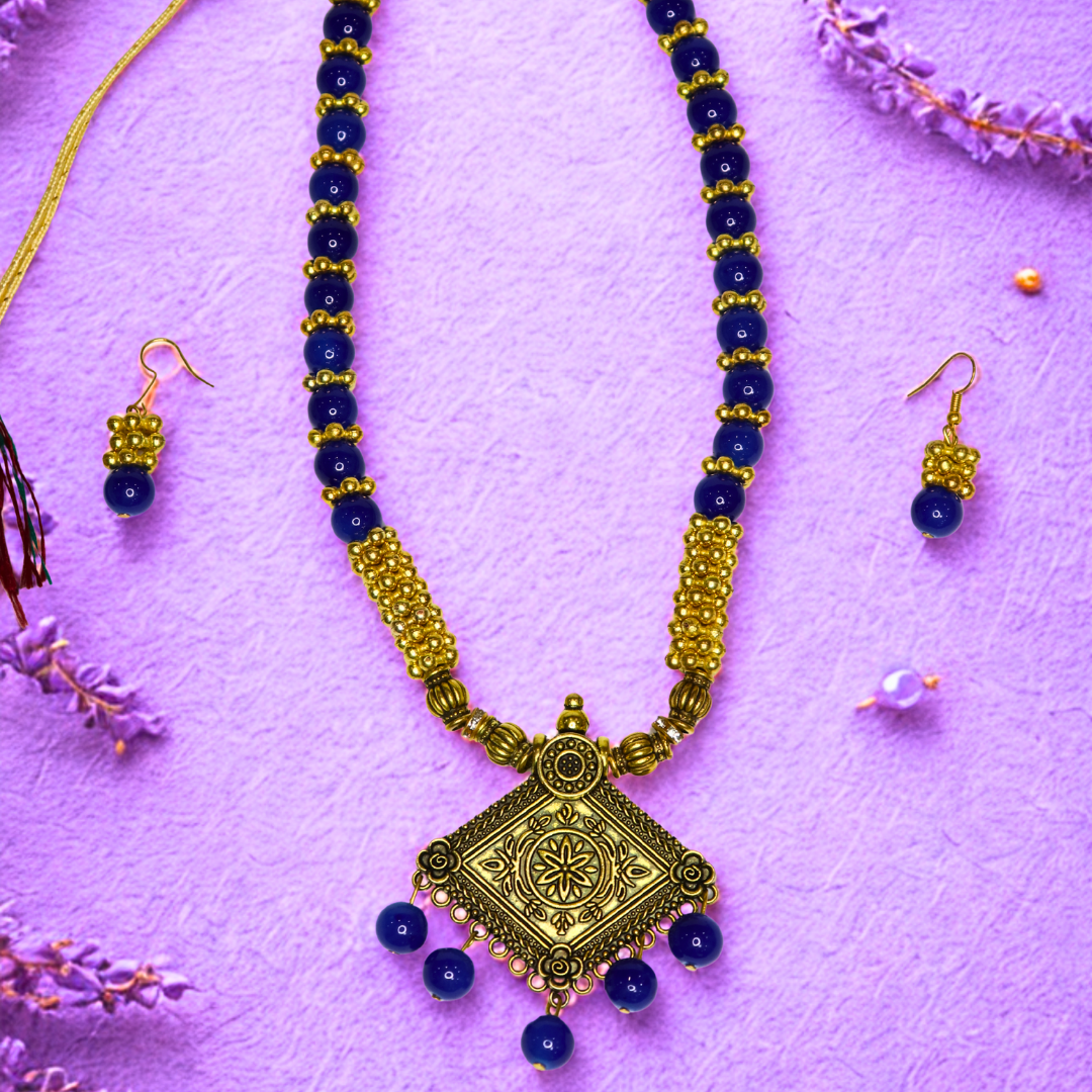 Make a bold ethnic statement with this Blue Beaded Necklace Set featuring a stunning antique gold square pendant and vibrant blue beads. The handcrafted design blends tribal aesthetics with traditional charm, while the matching earrings enhance the complete look. Perfect for weddings, festive occasions, garba, cultural events, or as a statement piece for Indo-western outfits, this lightweight and skin-friendly jewellery set adds a touch of elegance and heritage to any attire.