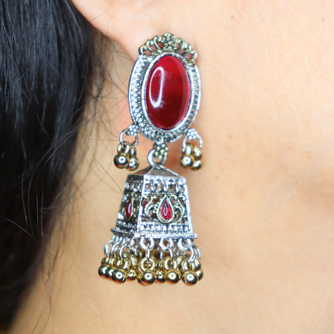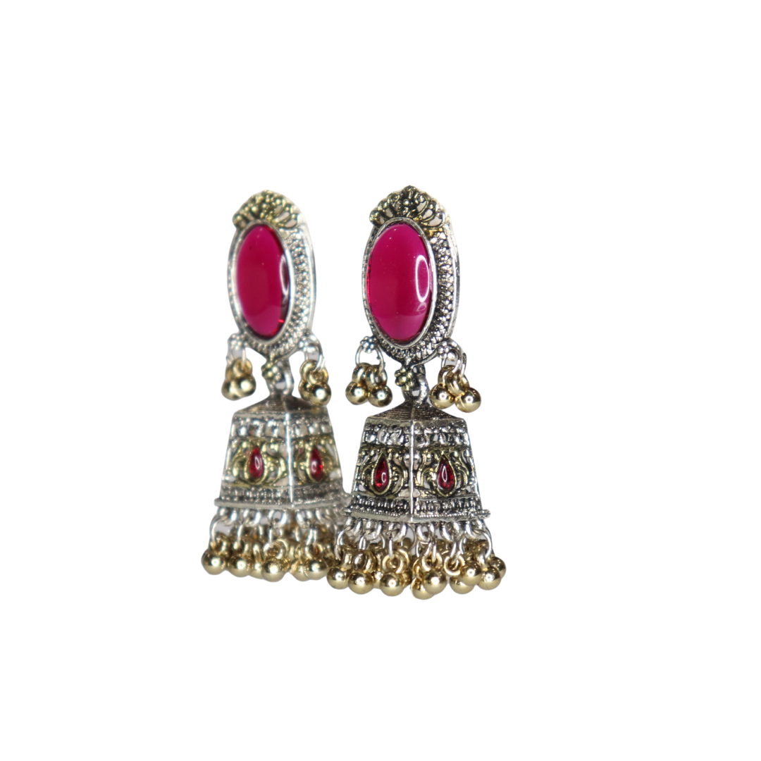 Dark Pink Reflective Glass Stone Oxidized Jhumka