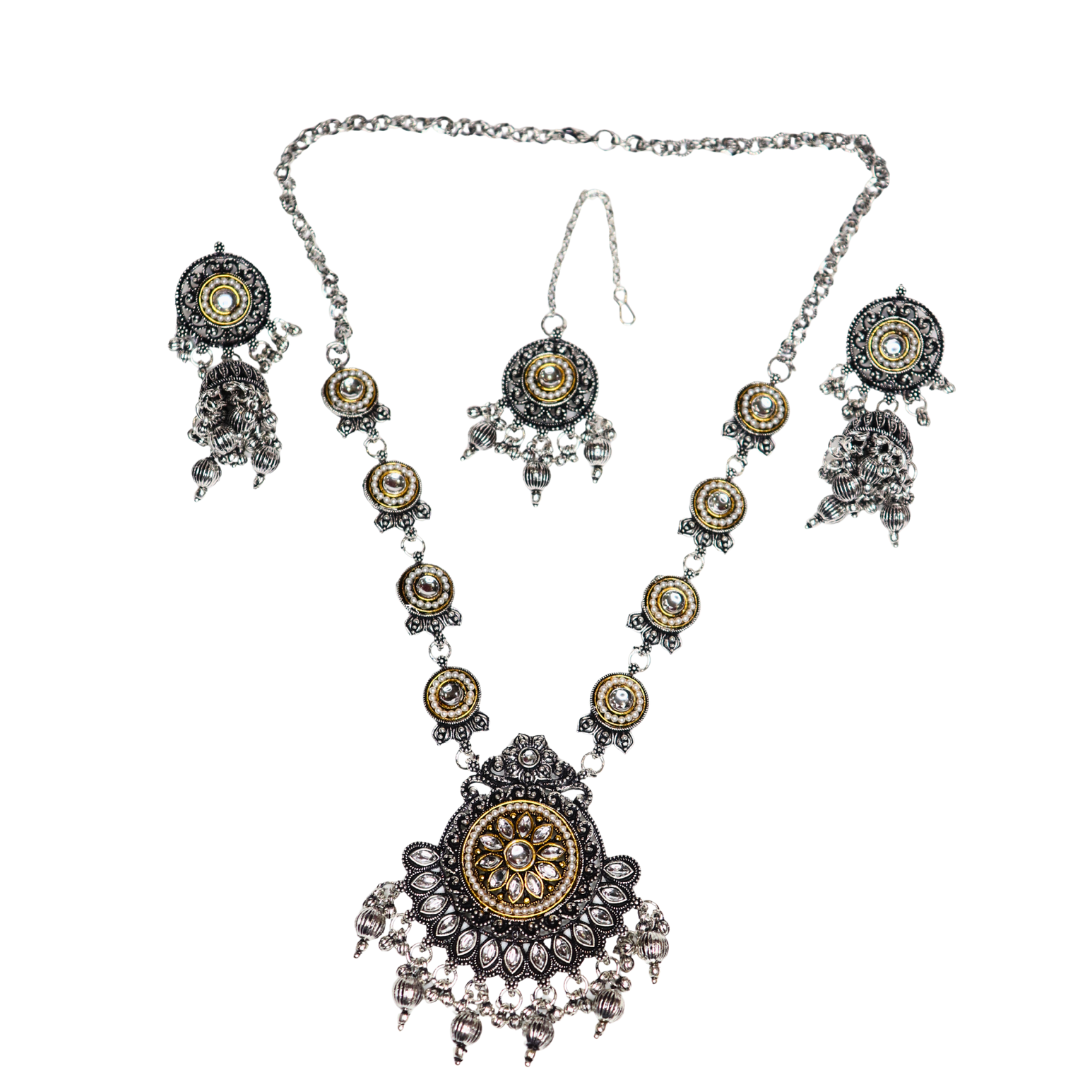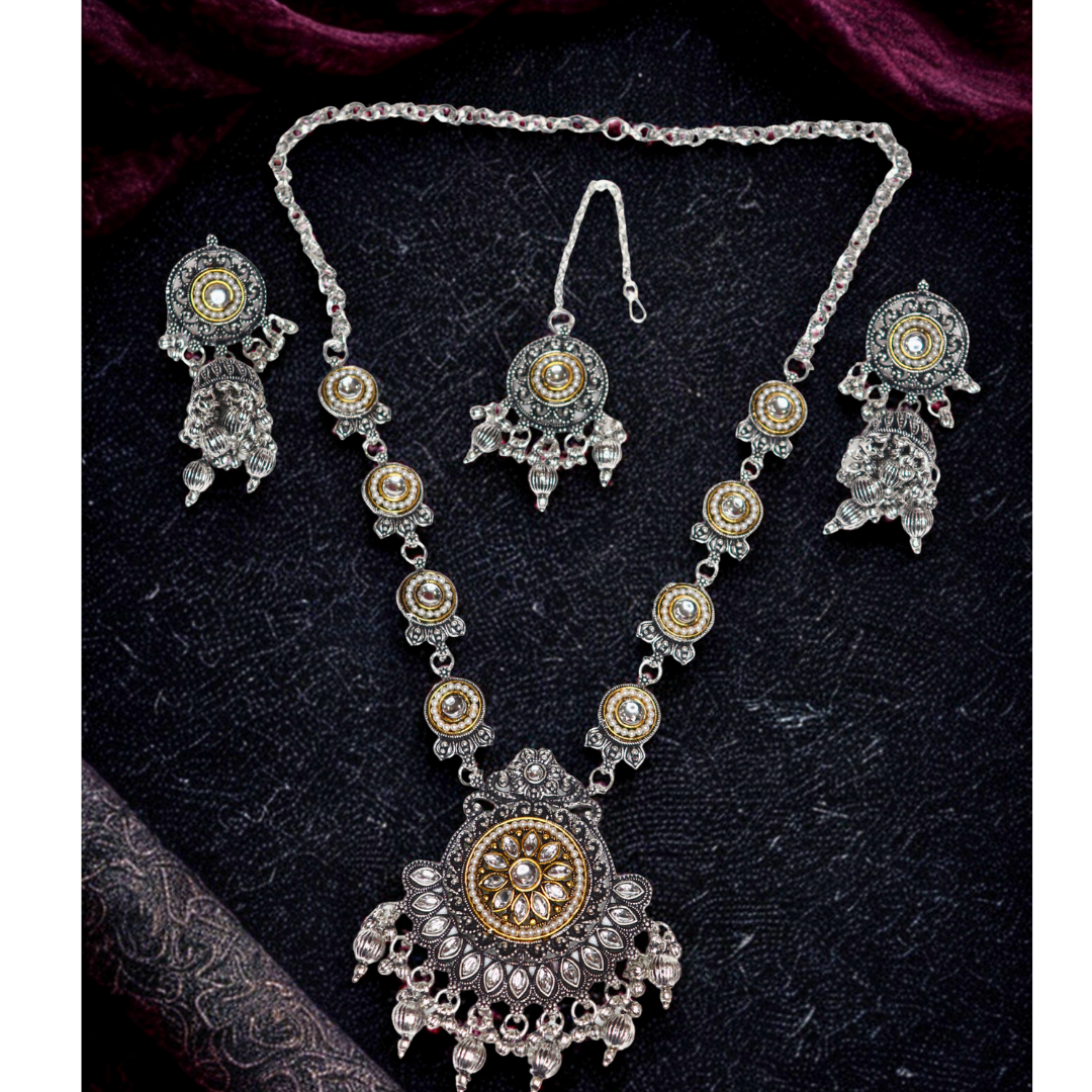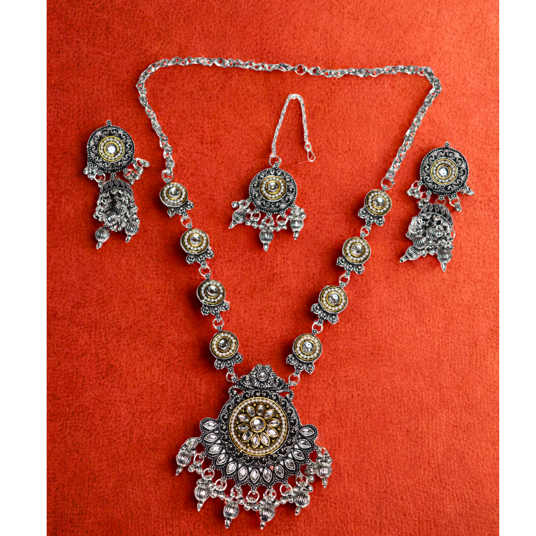 Oxidized Silver Necklace Set with Earrings & Maang Tika
