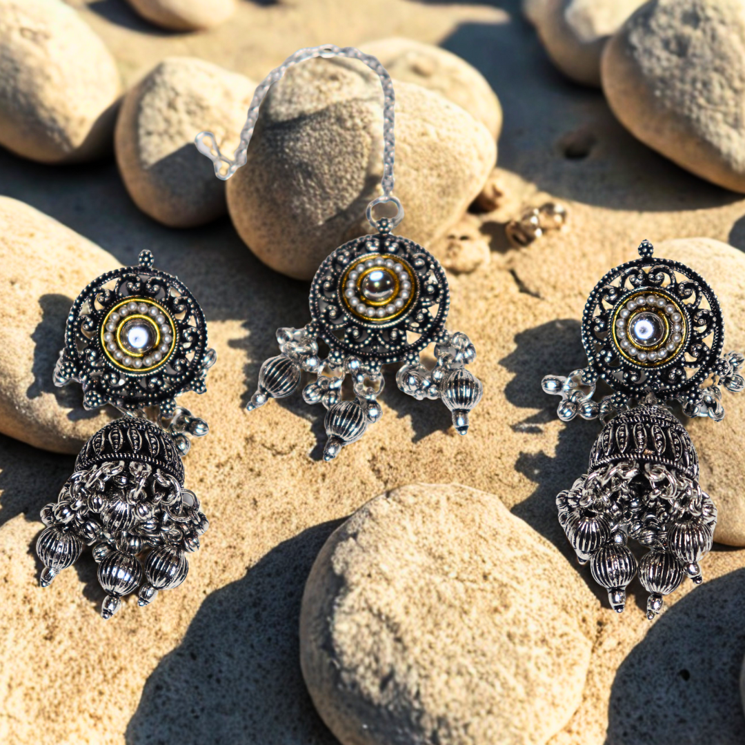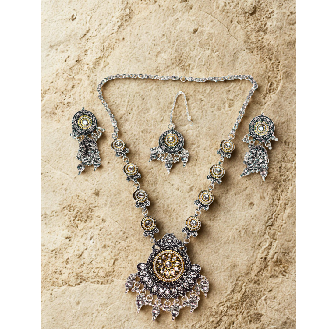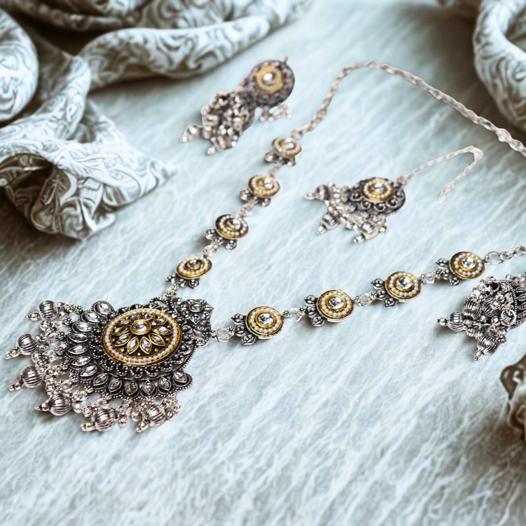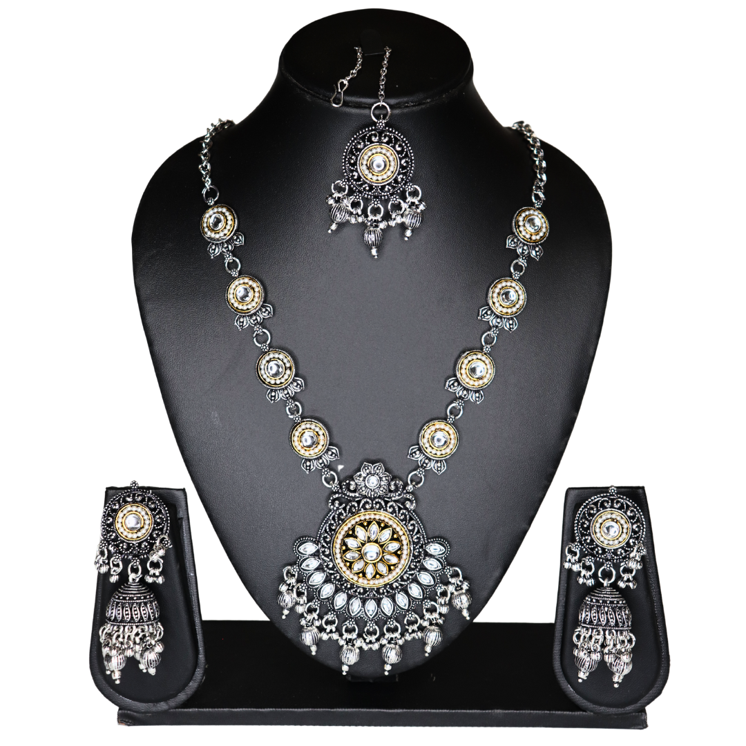 Oxidized Silver Necklace Set with Earrings & Maang Tika