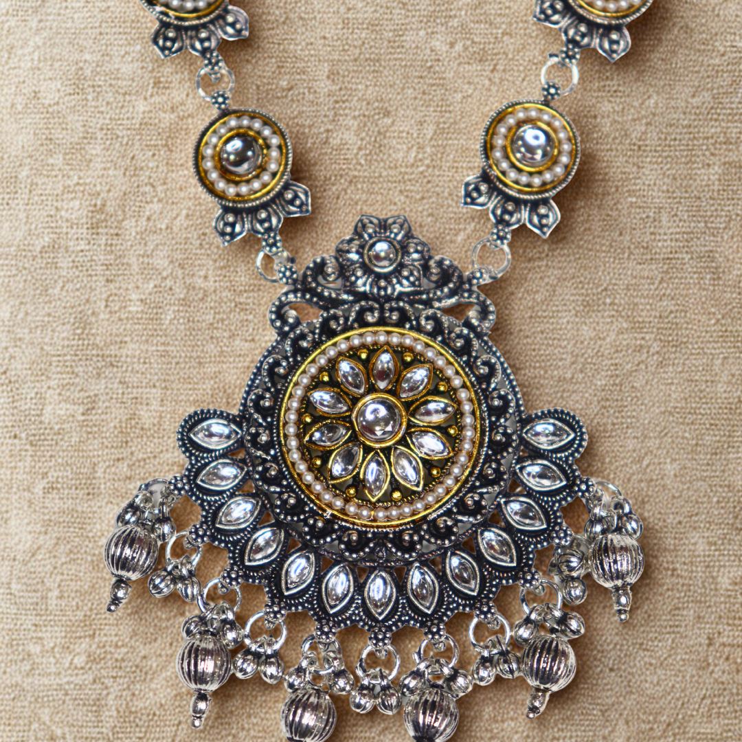 Add a touch of royal elegance to your ethnic look with this Oxidized Silver Long Necklace Set, featuring intricate floral motifs with antique gold-tone accents. The bold pendant is beautifully designed with filigree work and dangling beads, giving it a statement appeal. Paired with matching earrings and a maang tikka, this set is perfect for bridesmaids, festive occasions, weddings, or cultural celebrations. A versatile piece that blends heritage design with modern ethnic styling.
