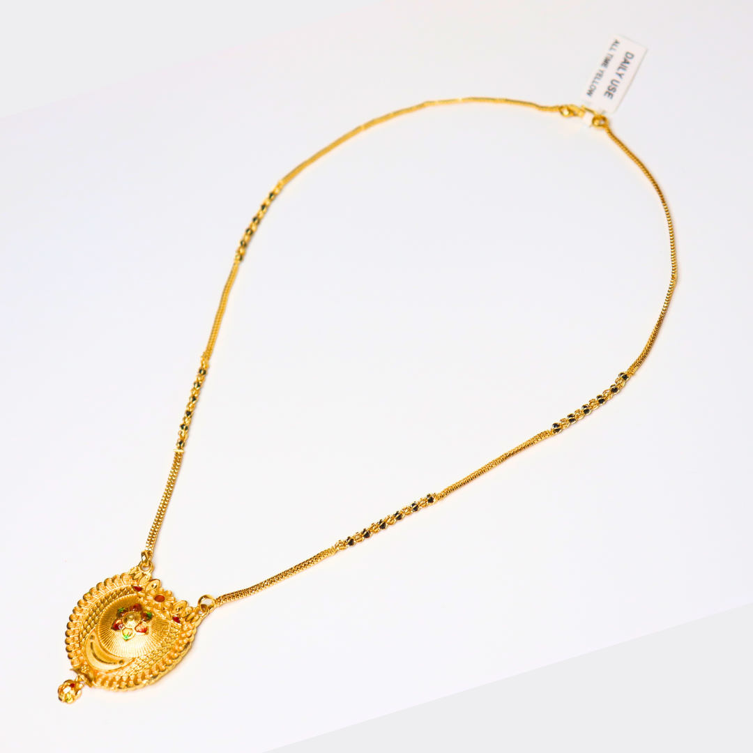 Celebrate the eternal bond of marriage with this beautifully crafted Traditional Gold-Plated Mangalsutra. Designed with a delicate black bead chain and a detailed round pendant with floral accents, this mangalsutra symbolizes love, trust, and prosperity. Its lightweight and skin-friendly design makes it perfect for daily wear while retaining a graceful, festive appeal for special occasions. A timeless jewellery piece every married woman should own.