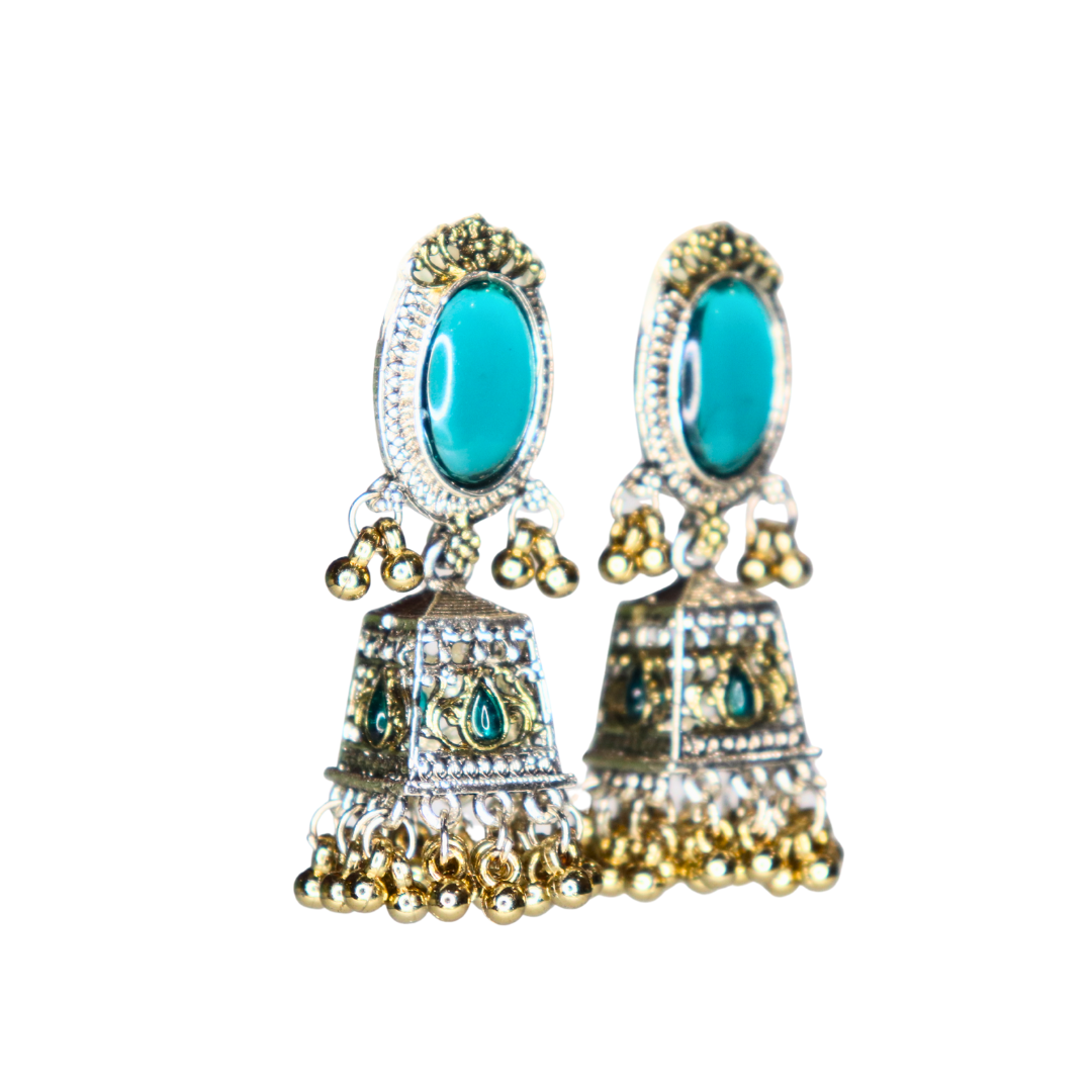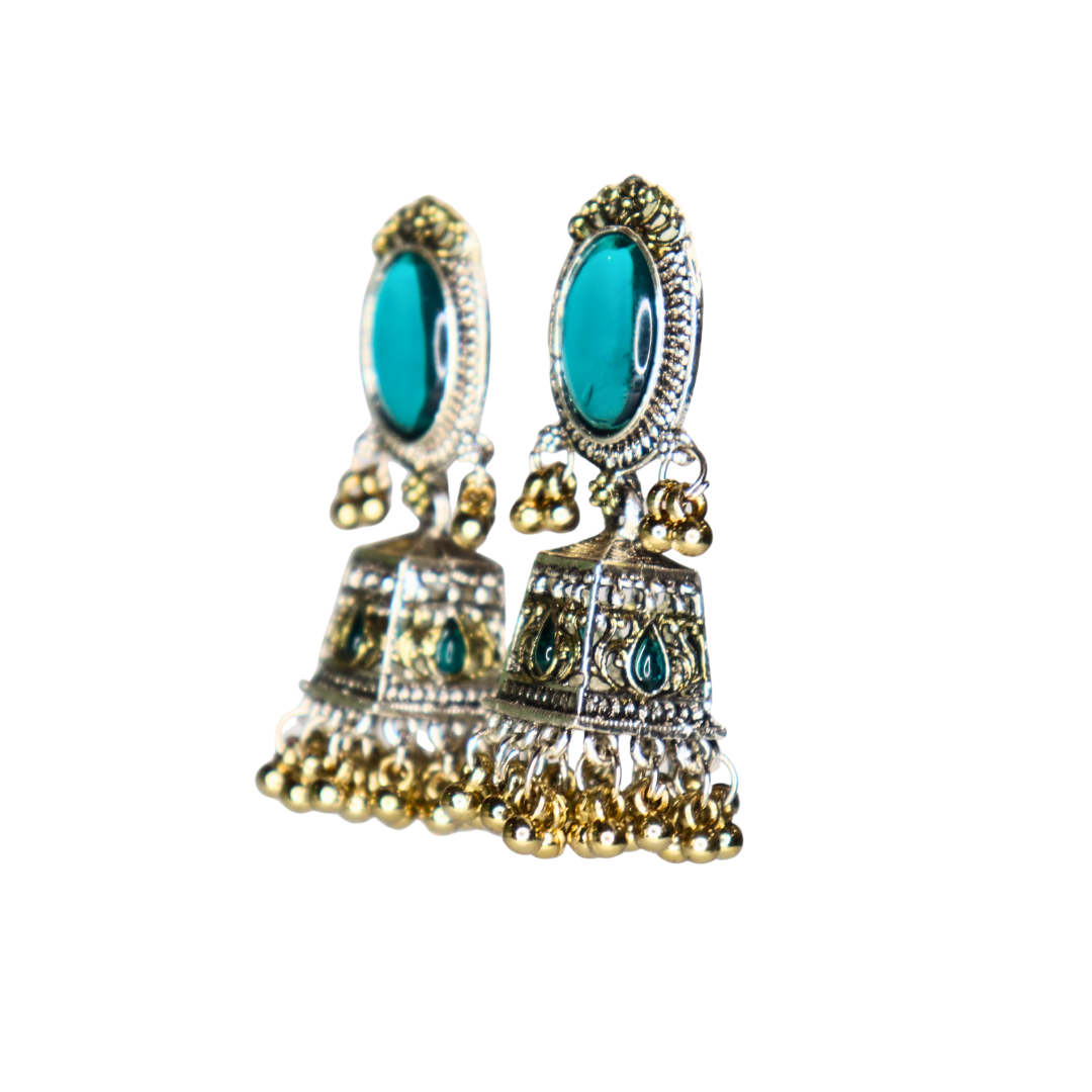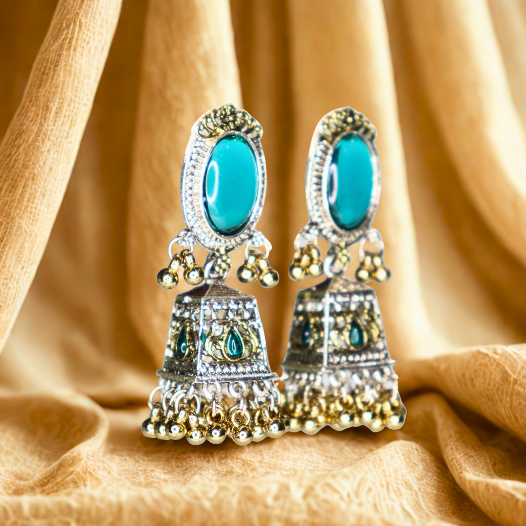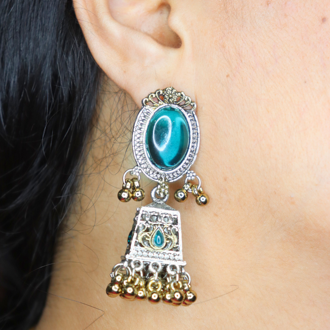 Turquoise-Teal Reflective Glass Stone Oxidized Jhumka